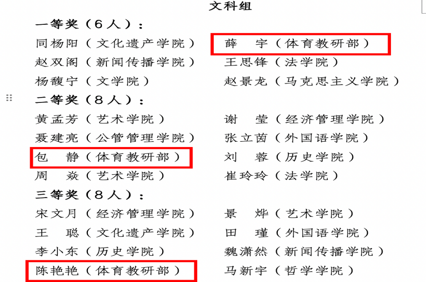 今年9月初,根据学校统一部署,体育教研部举办了部内教学创新大赛,经过认真准备与评审,推选出薛宇、陈艳艳、包静三位教师代表教研部参加西北大学第五届教师教学创新大赛。在校级比赛中,三位老师均表现优异,其中薛宇老师斩获文科组一等奖,包静老师获得文科组二等奖,陈艳艳老师获得文科组三等奖。体育教研部也因组织工作出色,荣获校级“优秀组织奖”。